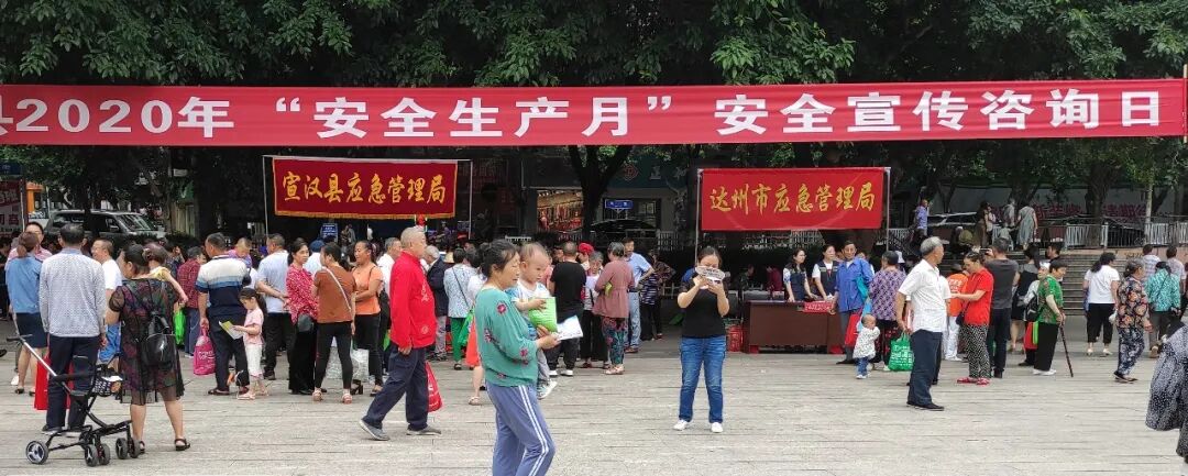 达州市安办联合宣汉县安办在宣汉县东门广场举办2020年“安全生产月”安全宣传咨询日活动,紧紧围绕“消除事故隐患,筑牢安全防线”的宣传主题,采取制作宣传展板、播放宣传动漫、发放宣传品等方式,通俗易懂地向社会公众宣传安全生产、防灾减灾、应急救援相关方针政策、法律法规及相关知识,面对面解答群众关心的安全生产问题,灵活多样地开展现场咨询服务活动。